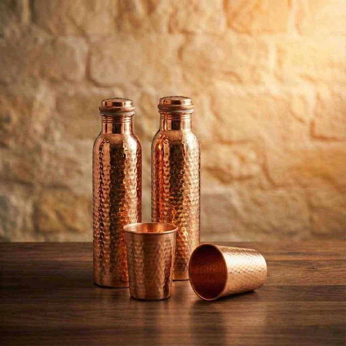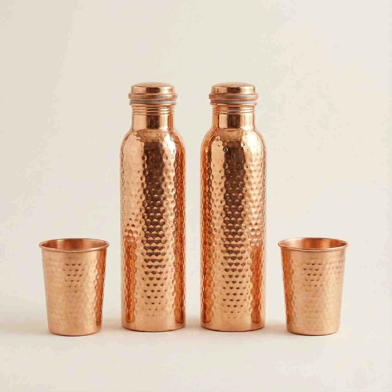 Perfect for home or office use, the bottles and glasses offer a reusable, plastic-free alternative for daily water consumption. With its handcrafted copper finish and balanced design, this set makes a meaningful gift that reflects care, wellness, and sustainability.